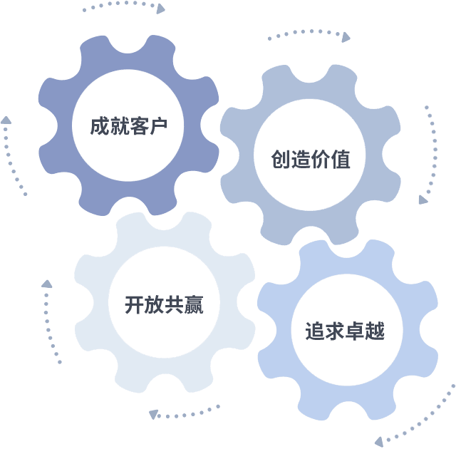 成就客户是一切决策的出发点,,,,创造价值是衡量所有工作的标准,,,,追求卓越是我们做事做人的态度,,开放共赢是我们的格局也是最终的结果。。。价值观的齿轮环环相扣,,推动着组织里的每个人不断向前。。。